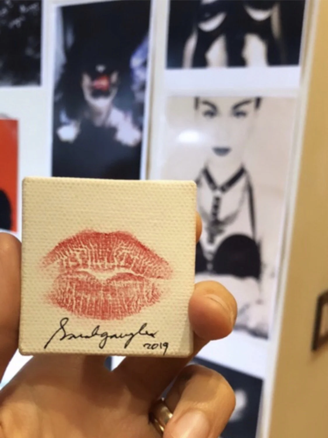 In 2019 a masterpiece by Sarah Gaugler of New York City titled "Authentic Presence," featuring a solitary kiss mark imprinted with vibrant crimson lipstick on a small 1.5 in by 1.5 in canvas. This tiny yet powerful symbol emerges as a symbol of bold emotion delicately pressed onto a small canvas and upon closer examination, revealed profound significance.