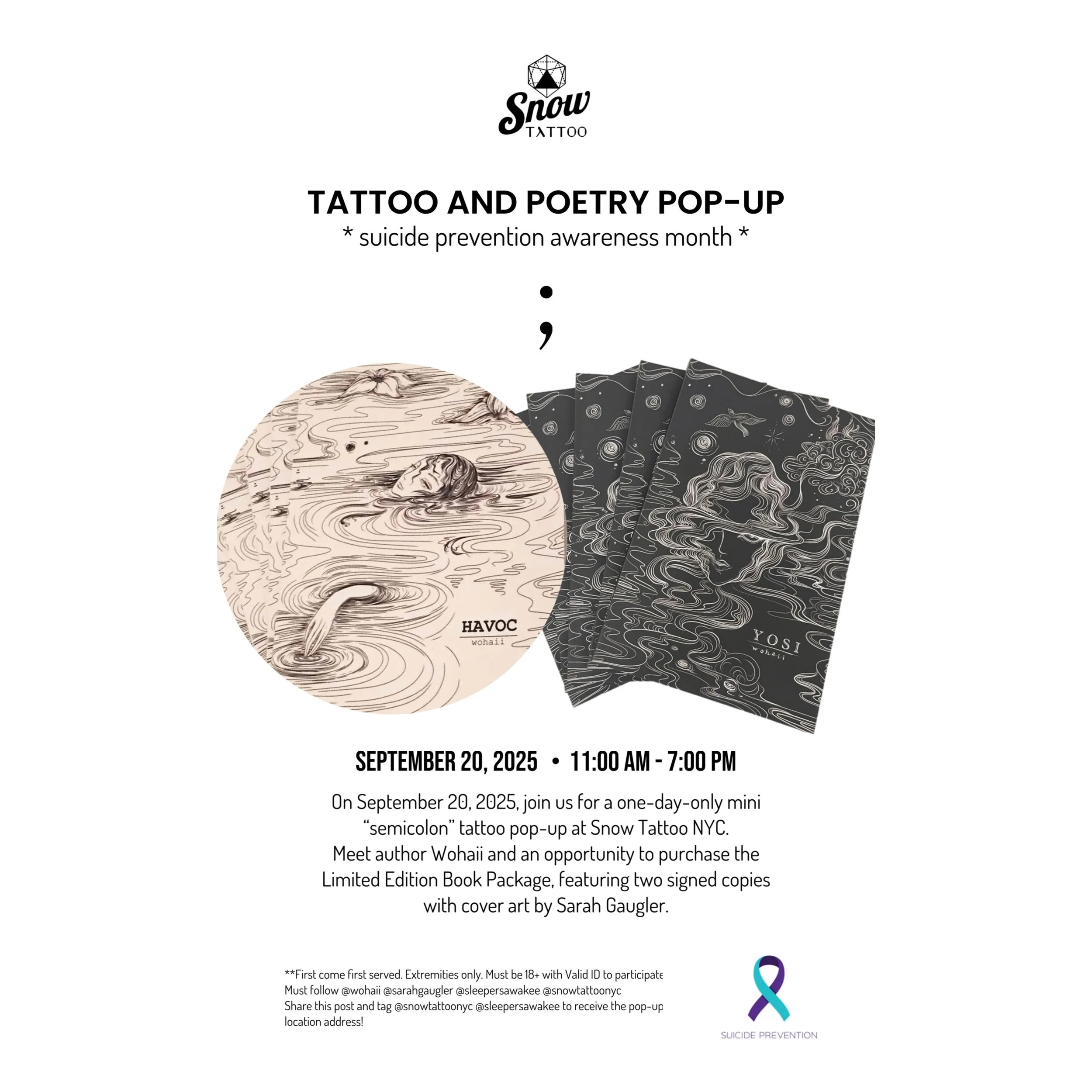 In September (2025), internationally acclaimed tattoo artist Sarah Gaugler, founder of Snow Tattoo NYC, collaborated with NY-based poet Wohaii for a deeply meaningful pop-up event in honor of Suicide Prevention Awareness Month. The event took place in the heart of New York City at Snow Tattoo located in Tribeca, and served as a safe, inclusive space where survivors, families, friends, and fans could gather, reflect, and share their stories and the powerful message that life is worth continuing.